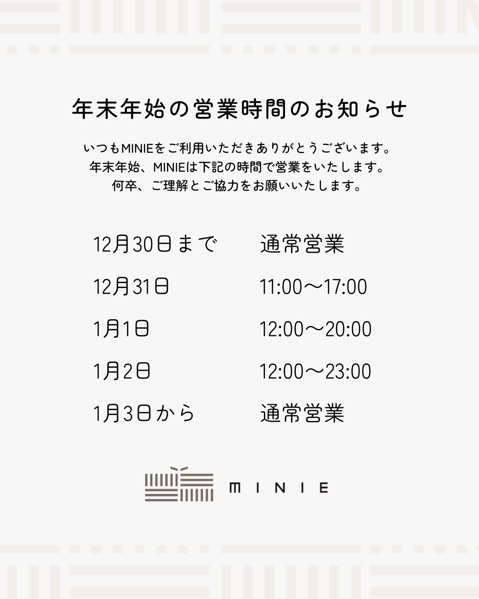 年末年始、MINIEは下記の時間で営業をいたします。